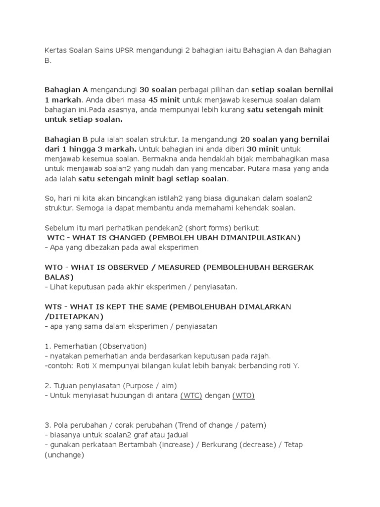 Kertas Soalan Sains Upsr Mengandungi 2 Bahagian Iaitu Bahagian A Dan Bahagian B Pdf